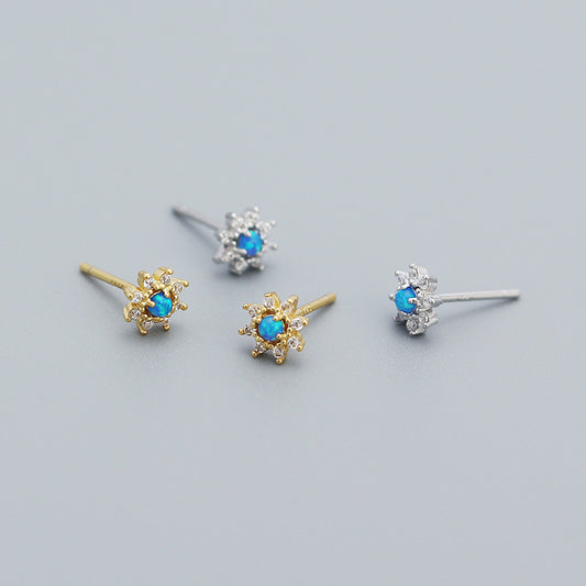Cute Mini Blue Created Opal CZ Flower Stud Earrings (925 Sterling Silver)