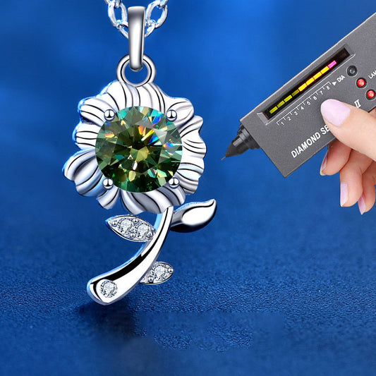 Beautiful Green Moissanite CZ Sunflower 925 Sterling Silver Necklace