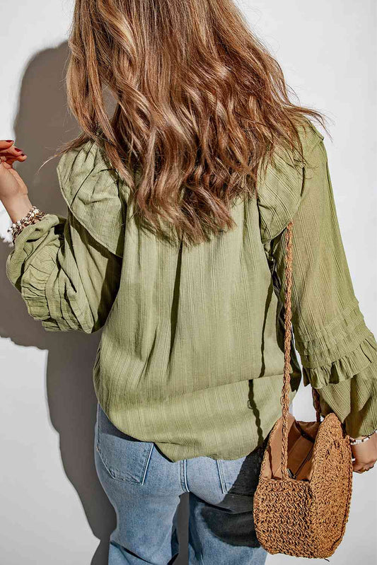 Ruffled Notched Neck Balloon Sleeve Blouse